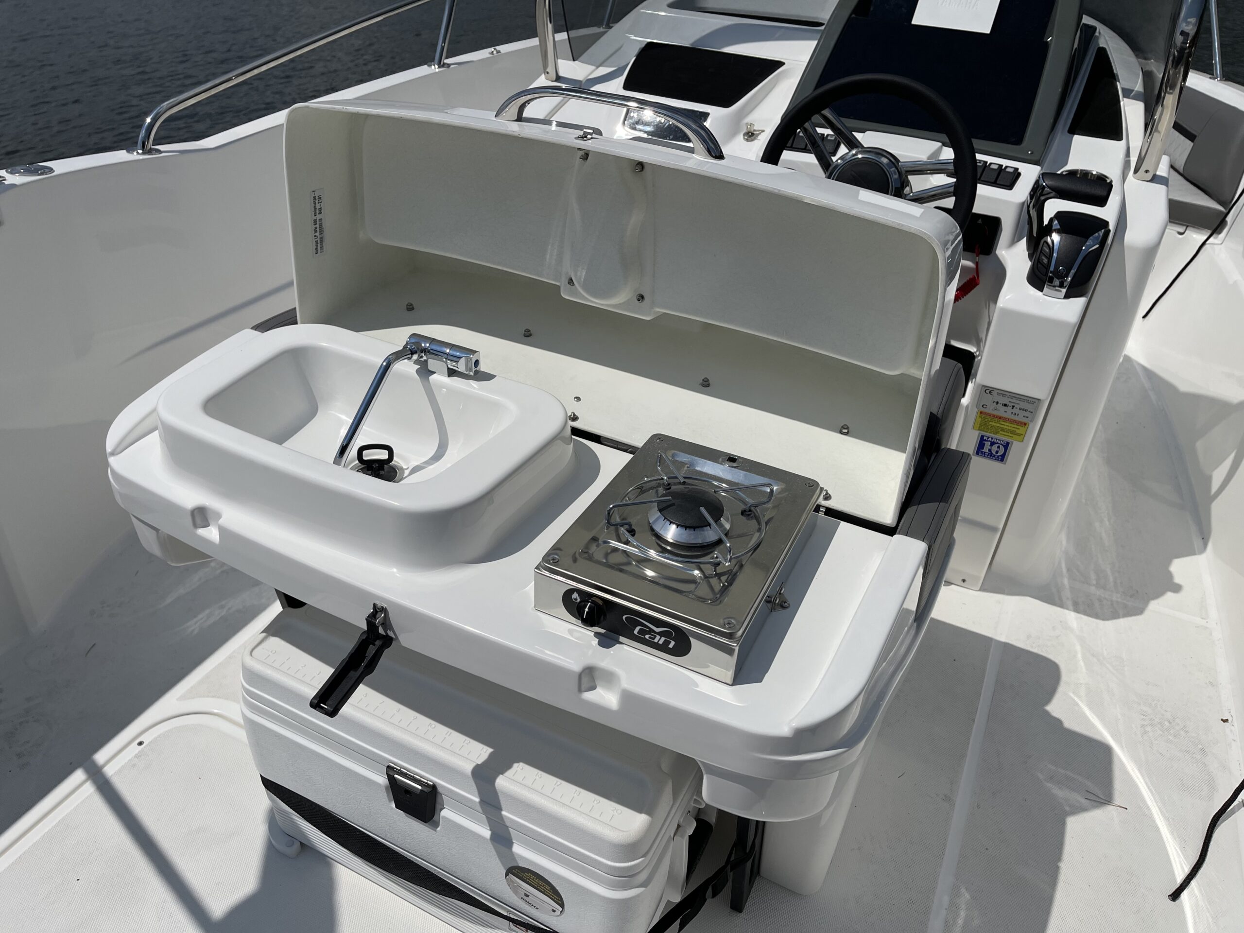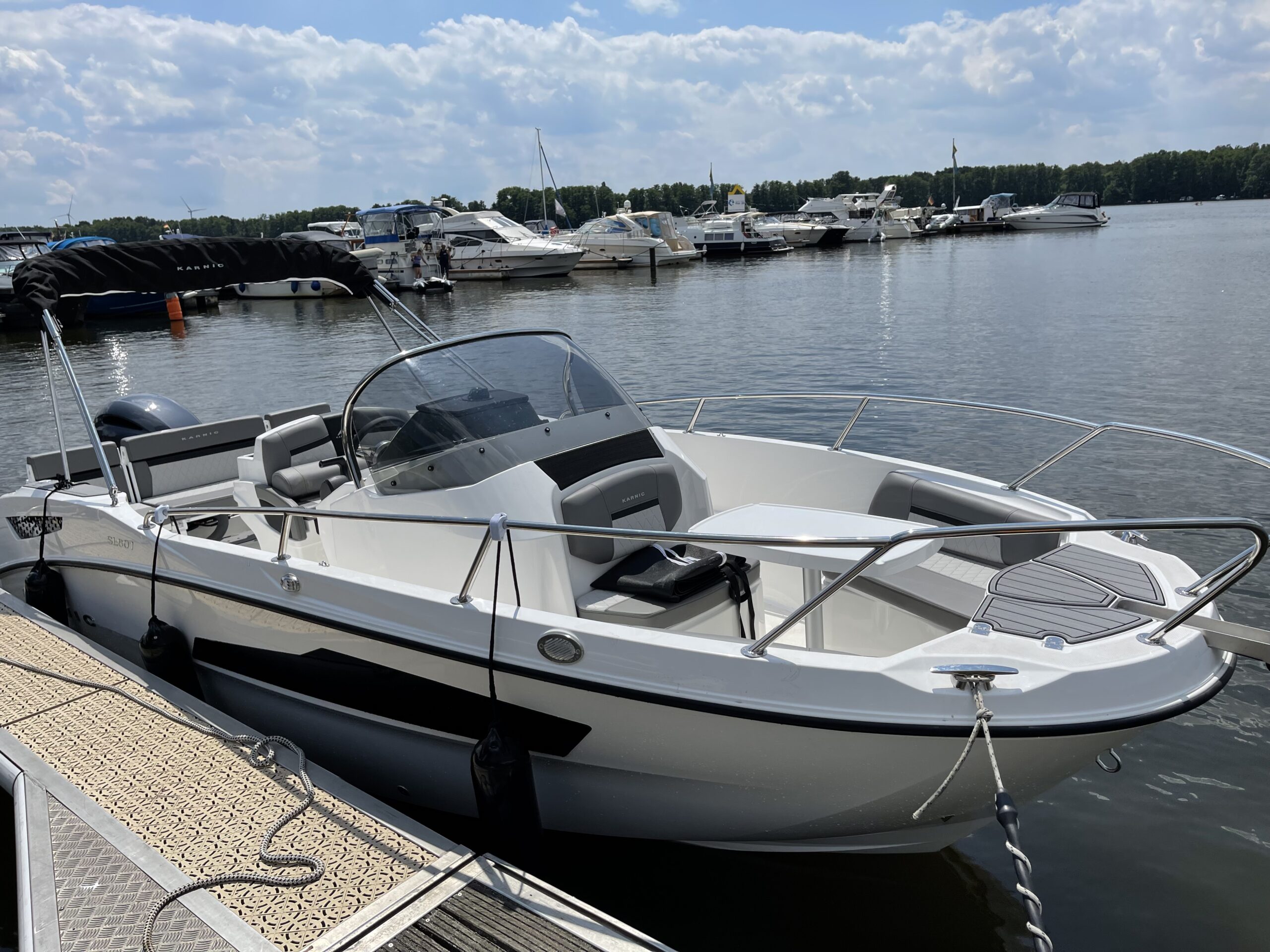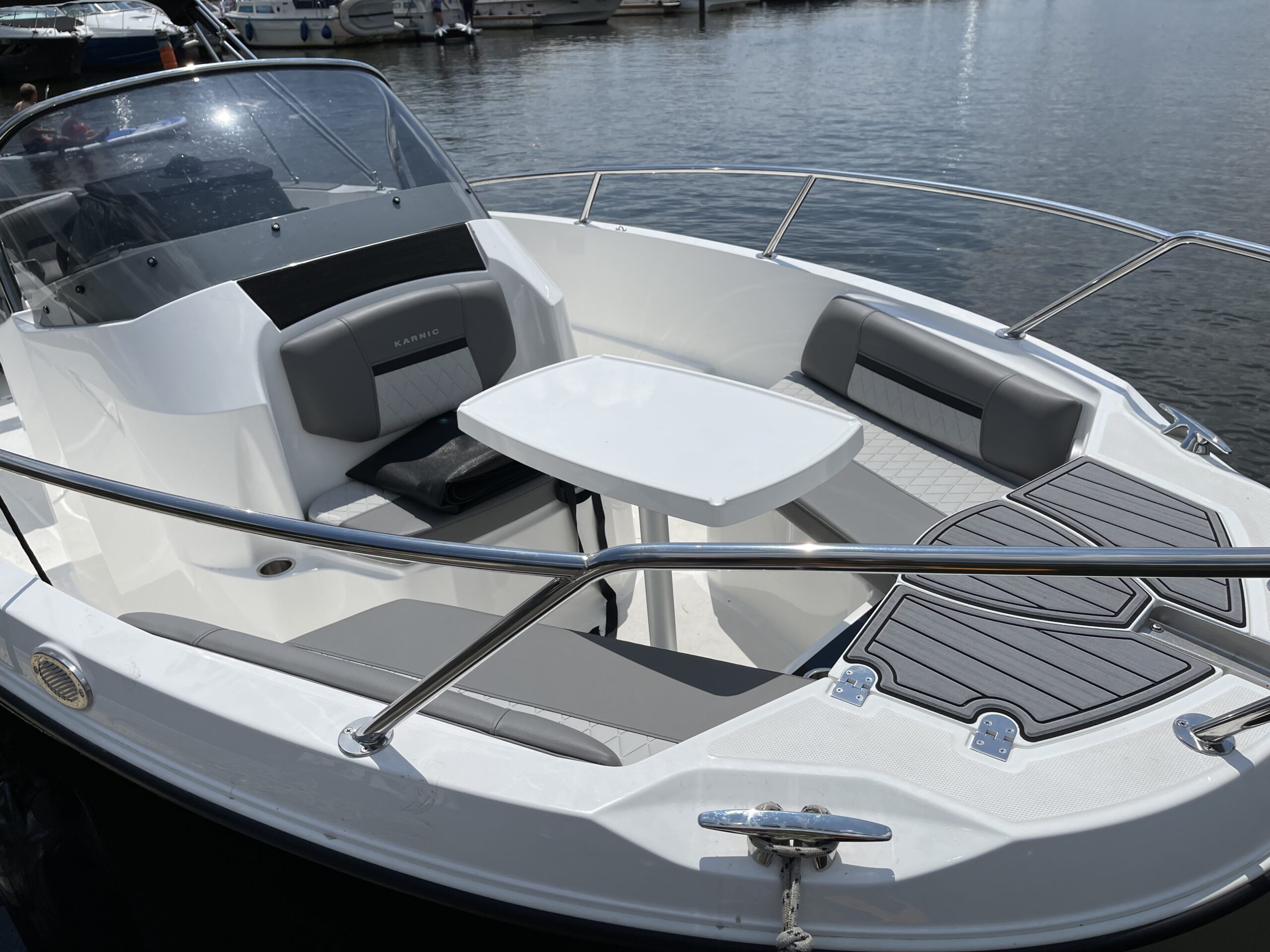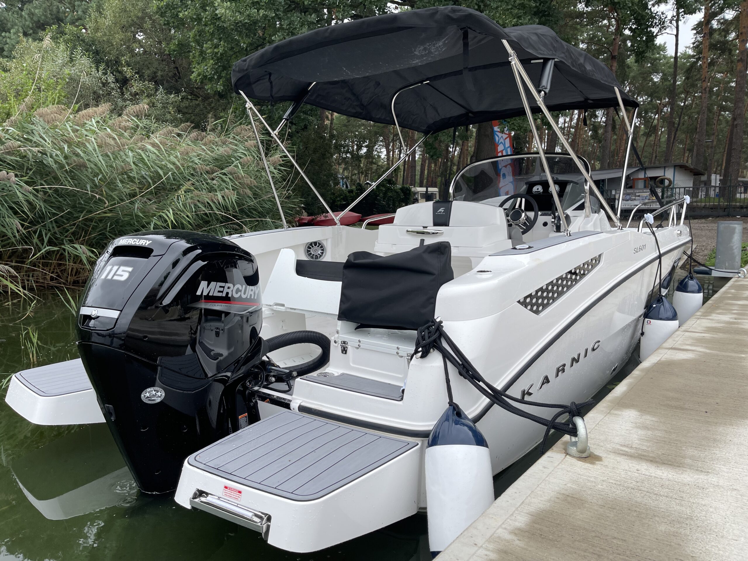 Um mit dem Karnic fahren zu dürfen, benötigst du einen Sportbootführerschein für die Binnengewässer. Ist der vorhanden und die Einweisung gegeben steht einer flotten Fahrt mit dem Karnic SL 601 nichts mehr im Weg! Mit dem 115 PS Außenbordmotor kann man schon mal richtig Gas geben.
